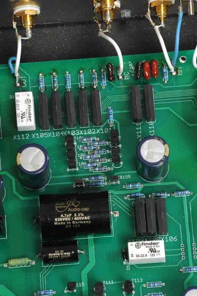 All components have been determined separately in cooperation with long lasting listening tests. Non-inductive resistors with only lowest tolerances, MKP, mica, oiled-paper capacitors and high quality internal wiring are just a few examples of the final selection of parts.