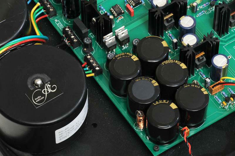 The power supply includes “R-C-L-C-LC” (inductor, resistor, capacitor) filtering and, unusually, additional capacitor multipliers. 60.000 µF per channel in the power supply as well as additional voltage buffering directly in the circuit, with high quality Panasonic FC capacitors are responsible for an ideal noise-free background. In combination with a high quality line filter, most power line interferences can be eliminated and the audio circuit works under the best possible conditions.